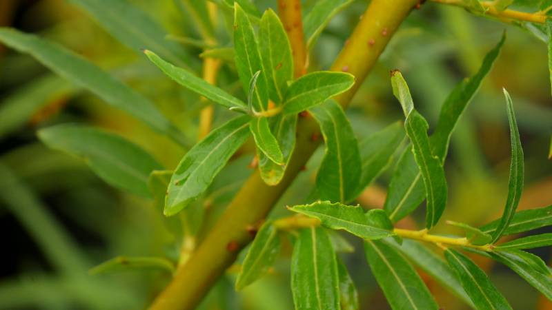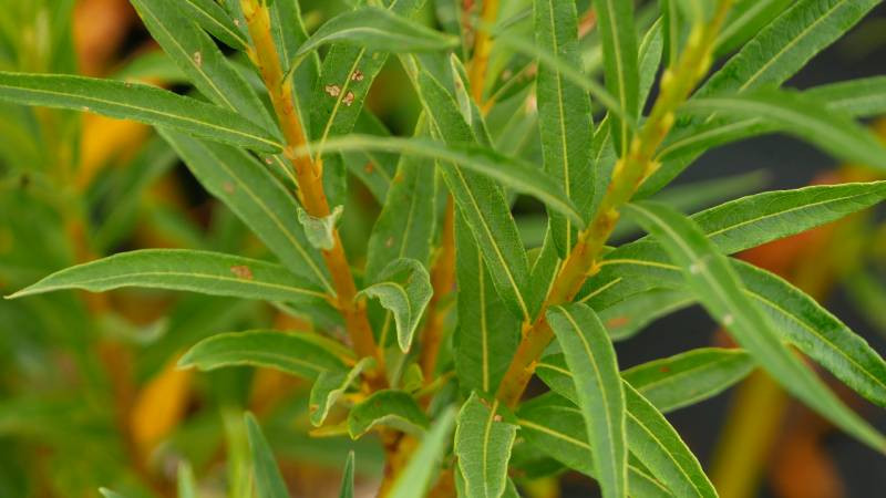 Son feuillage caractéristique est composé de longues feuilles lancéolées et soyeuses, vert clair d'un côté et blanc argenté sur le revers. Ce "Saule amarine" légèrement pleureur est particulièrement apprécié pour ses rameaux jaune orangé, presque doré, utilisés depuis longtemps en vannerie.