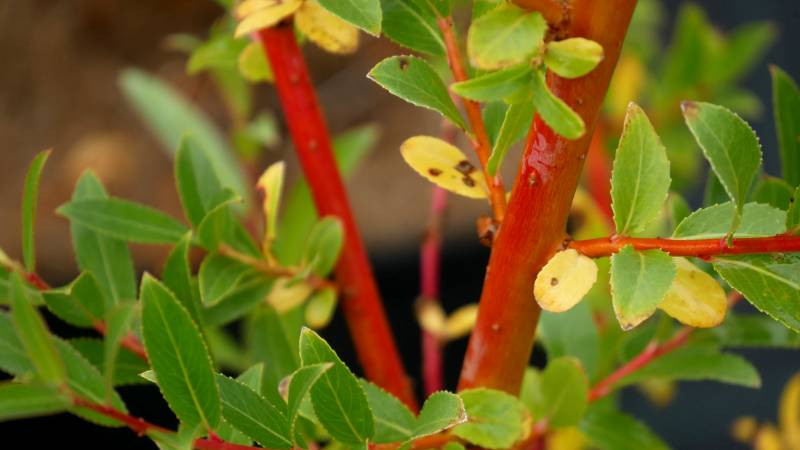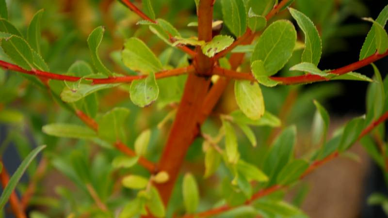 Son feuillage est composé de feuilles étroites et lancéolées, finement dentées : d'abord vert moyen à la belle saison, elles virent au jaune à l'automne.