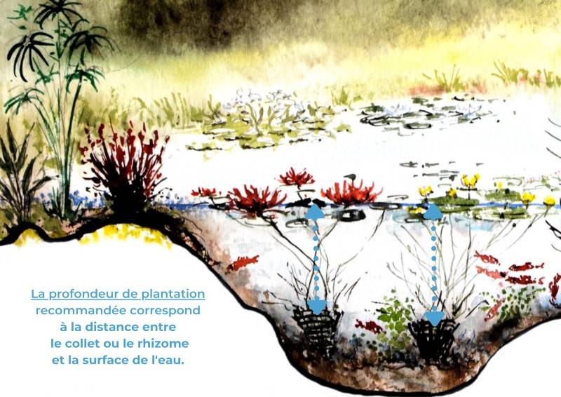 La profondeur de plantation recommandée correspond à la distance entre le collet ou le rhizome et la surface de l'eau.