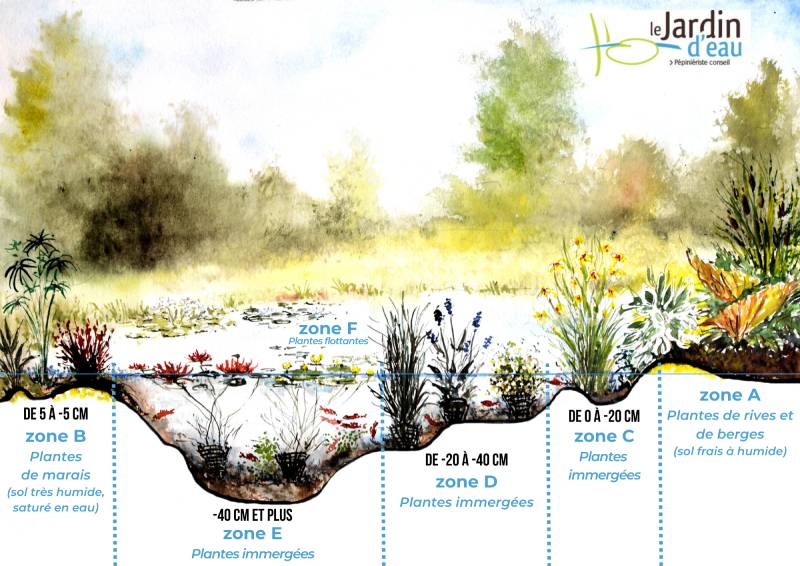 Le schéma ci-dessous vous présente les différents groupes de plantes aquatiques (Plantes de rives et de berges, Plantes de marais, Plantes immergées et Plantes flottantes), classées en 6 zones (A - B - C - D - E - F) en fonction de la profondeur d'eau adaptée à leurs installations.