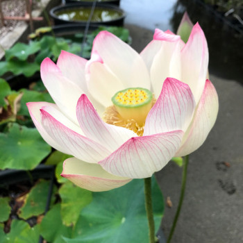Agrandir l'image Un grand lotus aux magnifiques fleurs blanches aux bords rouges : une variété américaine au contraste exceptionnel pour votre pièce d'eau !